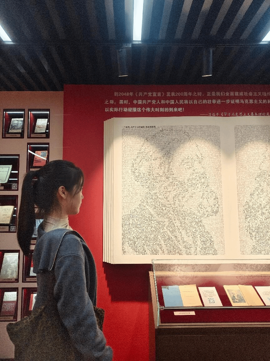 在华中师范大学马克思主义学院的“信仰之光——马克思主义文献典藏展”现场,人工智能学院学生第一、第三和第四党支部学员整齐列队,在专业讲解引导下系统参观四大主题展区。在“真理力量 薪火相传”展区,学员认真聆听马克思主义理论体系的形成脉络与发展历程;在“手稿藏书 经久弥珍”展区,众人驻足于《资本论》原始手稿等珍本文献前,深入品读经典著作的思想内涵;在“经典巨著 思想丰碑”展区,多种语言版本的《共产党宣言》及其传播历程引发学员深入思考;在“‘两个结合’最大法宝”展区,讲解员系统阐释马克思主义中国化时代化的理论创新与实践路径。展区共展出400余件珍贵文献与历史照片,辅以多媒体互动设备,生动呈现马克思主义在世界范围的传播与发展。学员们全程专注聆听,不时交流感悟,展现出严谨的学风与扎实的理论兴趣。
