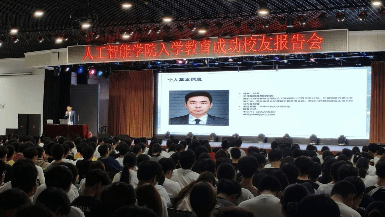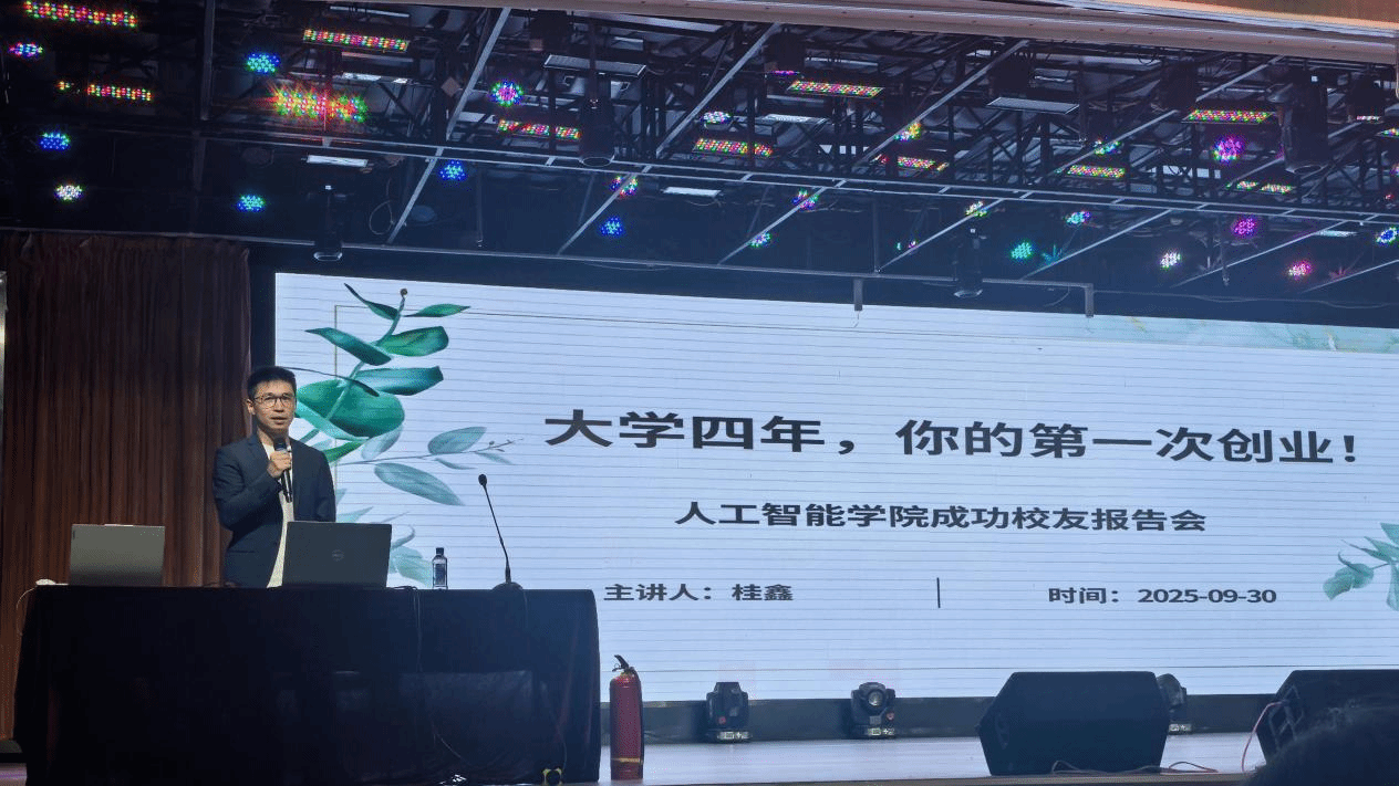 人工智能学院9月30日消息(通讯员 胡乐乐 付译可 报道)为助力2025级新生顺利开启大学生活新篇章,激发智能学子奋进动力,强化职业生涯规划意识,9月30日,人工智能学院于梅南礼堂举办成功校友报告会,特邀2009级电子信息工程专业优秀校友桂鑫进行演讲,以“大学四年,你的第一次创业”为主题,帮助人工智能学院2025级新生找准成长坐标、激发奋进动力。