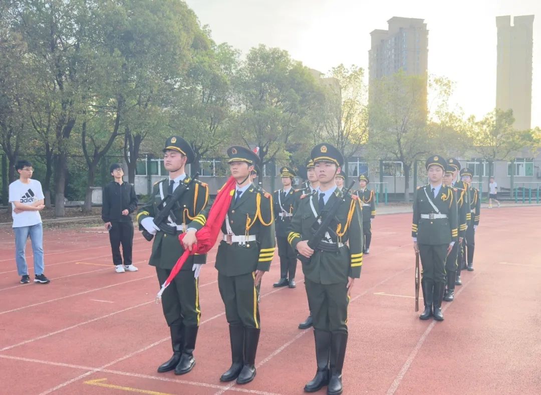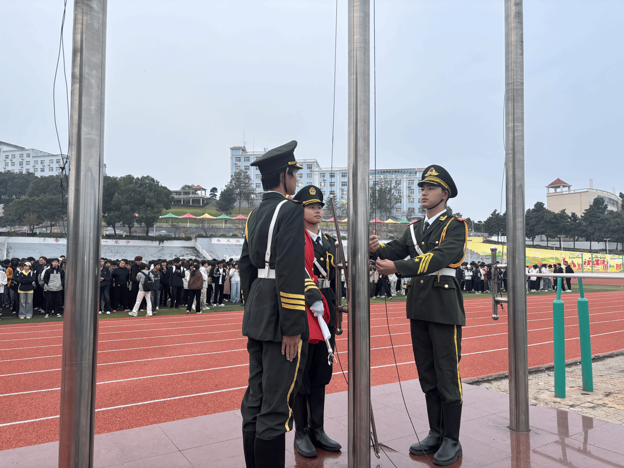 伴随着《义勇军进行曲》激昂的旋律,国旗护卫队队员身着整齐制服,以挺拔的身姿、铿锵的步伐,迈着高度统一的正步,小心翼翼地护送五星红旗走向升旗台。此刻,全体师生迅速调整站姿,面向国旗肃立致敬,嘹亮的国歌在田径场回荡,大家目光紧紧追随着冉冉升起的五星红旗,心中的爱国之情与民族自豪感油然而生。