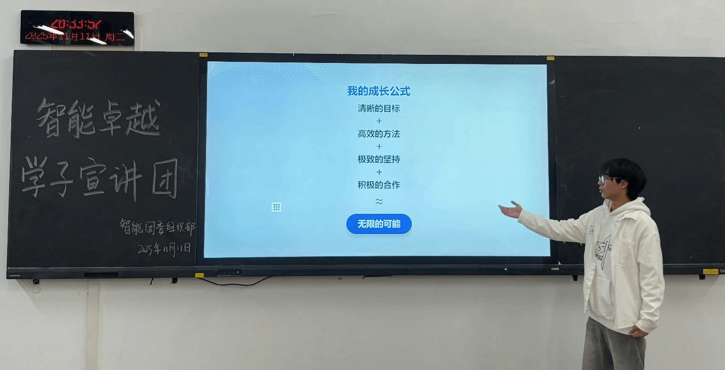 人工智能学院11月11日消息(通讯员 阮思宇 付雨欣 报道)为深化朋辈引领,凝聚青春奋进力量,助力智能学子明晰成长方向、积累发展经验。11月11日,人工智能学院团委于智能319开展了“智能卓越学子宣讲团”主题宣讲活动。本次活动邀请了软工2303王序苒、机械2301尹创奇两位国家奖学金获得者作为活动主讲人。为现场学生带来一场关于学业精进、竞赛攻坚与综合发展的经验盛宴。