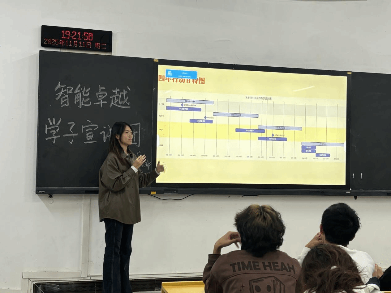 活动伊始,王序苒以“做一个‘长期主义者’——解读我的大学成长逻辑”为核心,从“破局思维”“四年行动甘特图”“主流发展路径”“软实力续航”四大维度展开分享。她提出“职业规划是匹配题而非选择题”的理念,通过兴趣雷达图、能力证据链等工具引导同学们锚定成长方向,以分阶段的行动规划清晰呈现大学四年的学业、竞赛、实践路径,传递了“以长期视角沉淀成长”的价值导向。