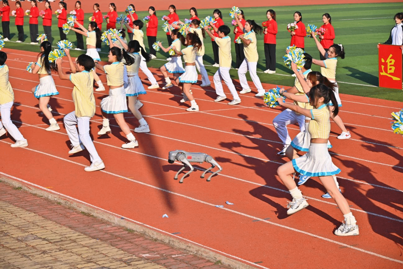 人工智能学院表演方阵踏着激昂旋律而来,队伍前方的灵动机械狗格外吸睛——银色外壳在阳光下闪耀科技光芒,步伐精准、关节运转富有韵律。队员们随节奏舒展肢体,或同步摆臂、或错落转身,灵动舞姿与机械狗的精准动作默契呼应,时而并肩前行、时而变换队形,将科技活力、舞蹈美感与运动激情完美融合。