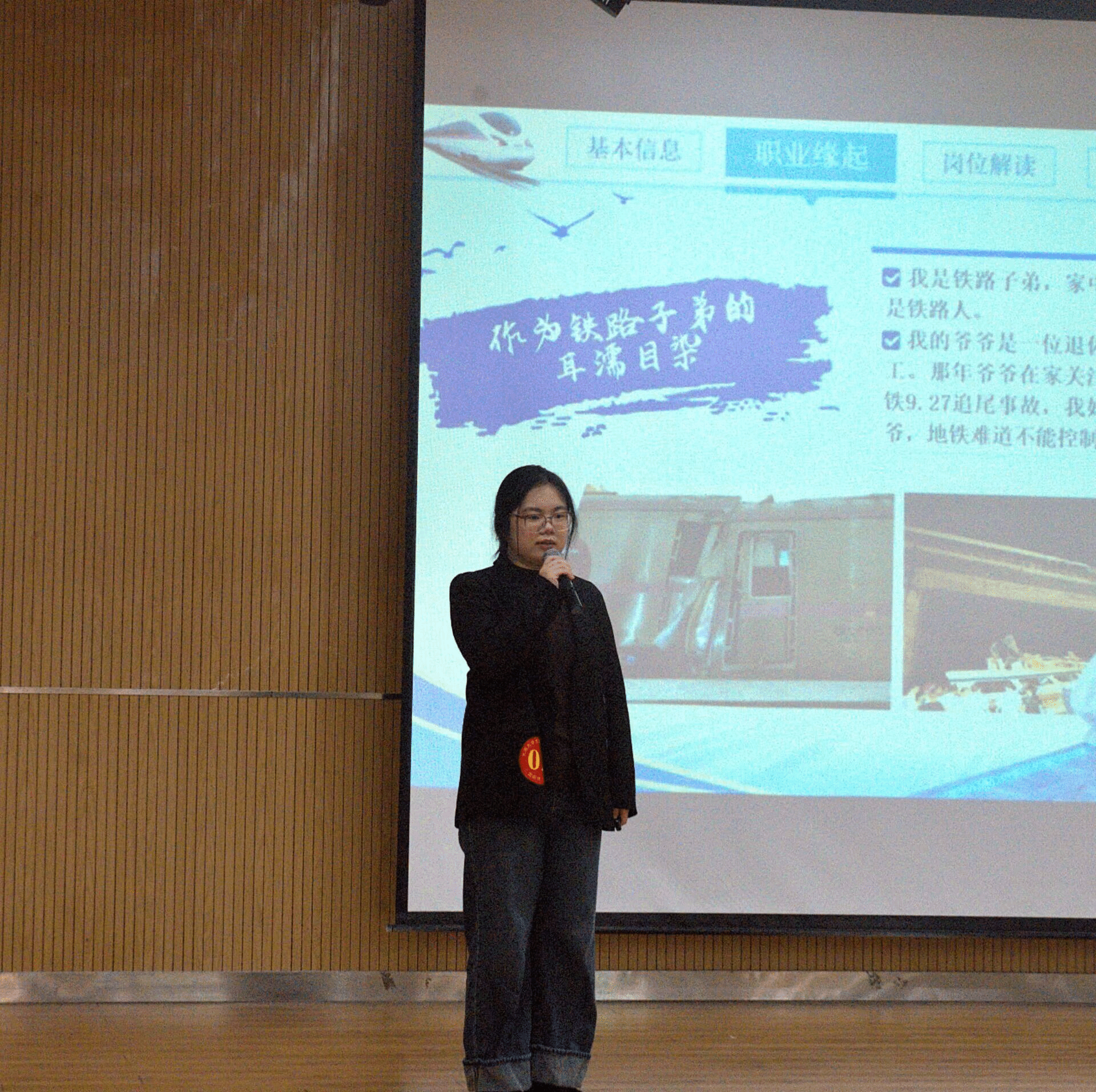 比赛现场,电气2401阙月带着“铁路家庭”的三代传承站上舞台,以“守‘电’初心,逐梦交轨”诠释职业追求。祖辈深耕铁路电气领域的坚守,在她心中种下“守护交通动脉”的种子。专业第一的优异成绩、丰富的科研实践经历,让她锚定“轨道交通装备电气工程师”目标。紧扣交通强国战略需求,她用扎实专业能力勾勒“以技术护航出行”的成长蓝图,尽显青年一代的责任与传承。