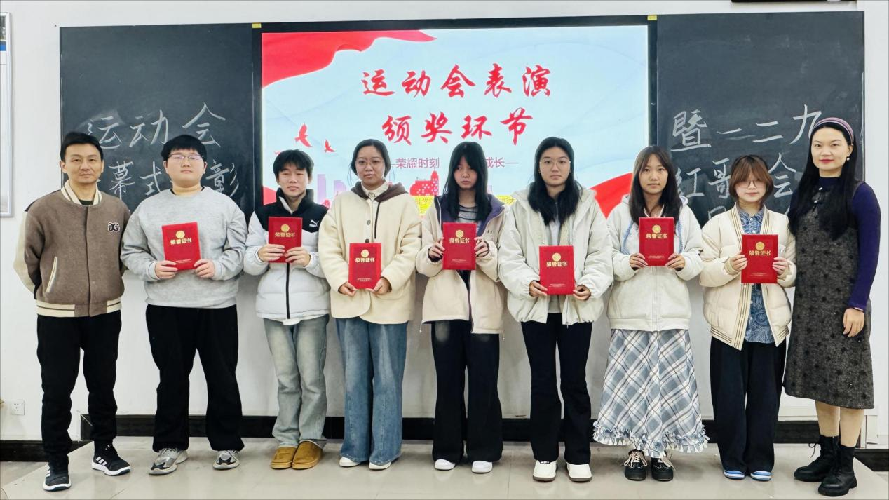 在热烈的掌声中,余阳书记与陈思敏老师一同为同学们颁发奖项,镜头记录下师生并肩而立的温馨瞬间。而在掌声背后,那些不为人知的付出同样值得铭记:文艺部同学连夜调整队形、四处奔波借调道具,陈思敏老师反复推敲每一个动作细节。正是因为汇聚了每个人的一点光芒,才共同点亮了舞台上耀眼的光彩。