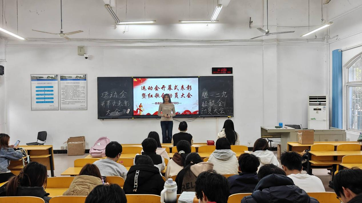 陈思敏老师发言后,余阳书记对本次大会进行总结。他先结合运动会开幕式的表现,强调“团结协作”与“精益求精”在集体活动中的重要性,提到这些品质不仅能支撑活动成功,也能助力同学们的日常学习与成长;随后,余书记围绕一二九红歌会的动员,说明红歌会的纪念意义与学院的重视程度,鼓励各班级提前规划节目内容,兼顾思想性与观赏性,同时提醒同学们合理分配时间,确保活动筹备与学业任务互不耽误。