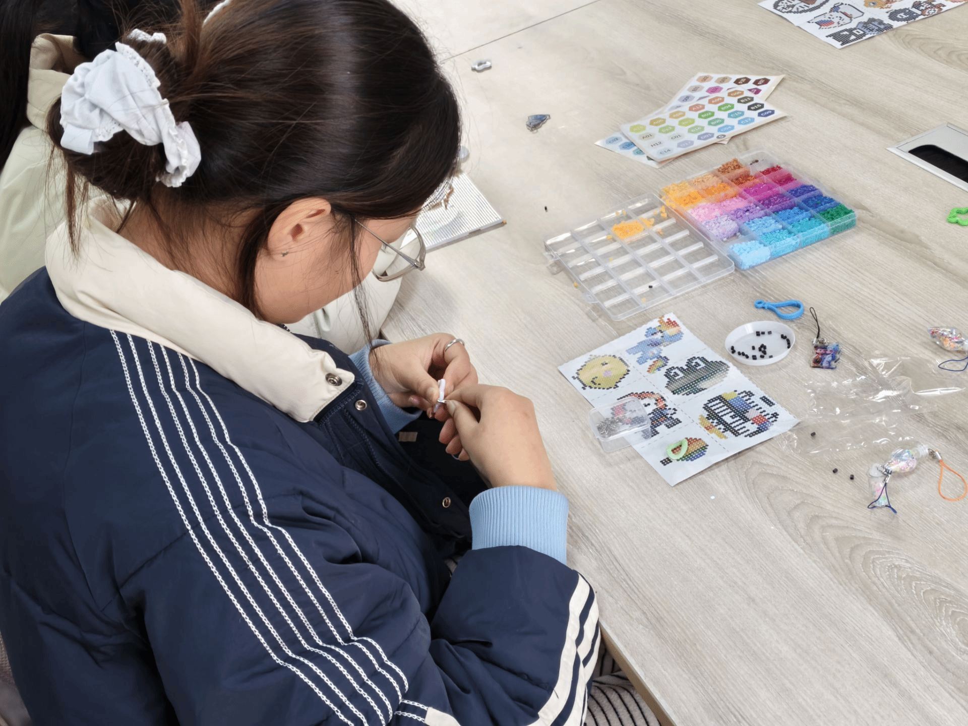 手工创作环节,同学们自由选择拼豆或许愿瓶项目,沉浸式投入创作之中。巡回在场的工作人员耐心巡场指导,及时为同学们答疑解惑。活动现场暖意融融,不同专业、不同年级的学子围坐一起,或分享设计思路,或组队协作创作,在指尖的巧思与互动的欢笑里,不仅锻炼了动手实践能力,更拉近了彼此的距离,收获了珍贵的友谊。创作尾声,同学们主动分享作品背后的创作理念与心愿故事,大家手持精心完成的作品合影留念,定格下这段温馨的时光。活动结束后,学子们将手工作品带回家珍藏,工作人员同步发放反馈问卷,收集大家的意见建议,为后续活动的提质升级筑牢基础。作品,工作人员同步收集了参与者的反馈问卷,为后续活动的优化提供参考。