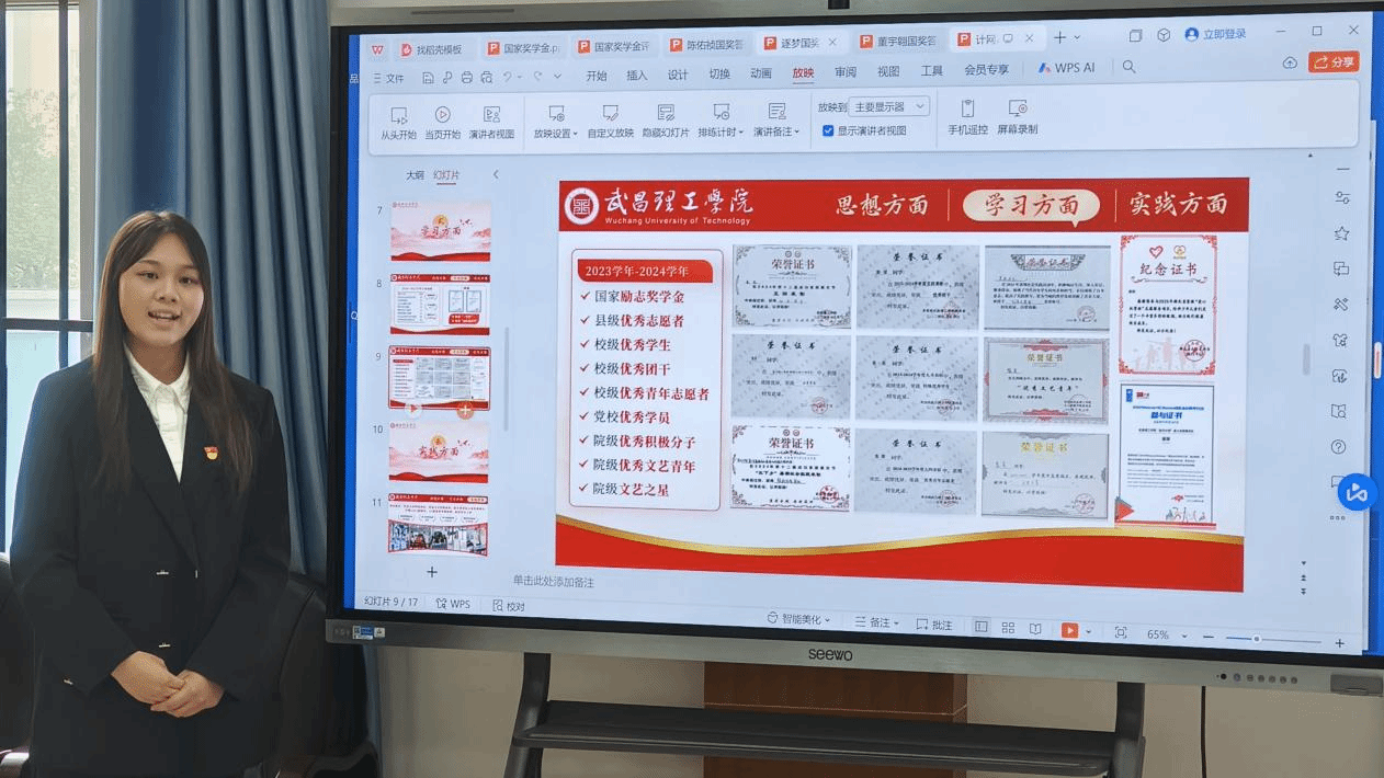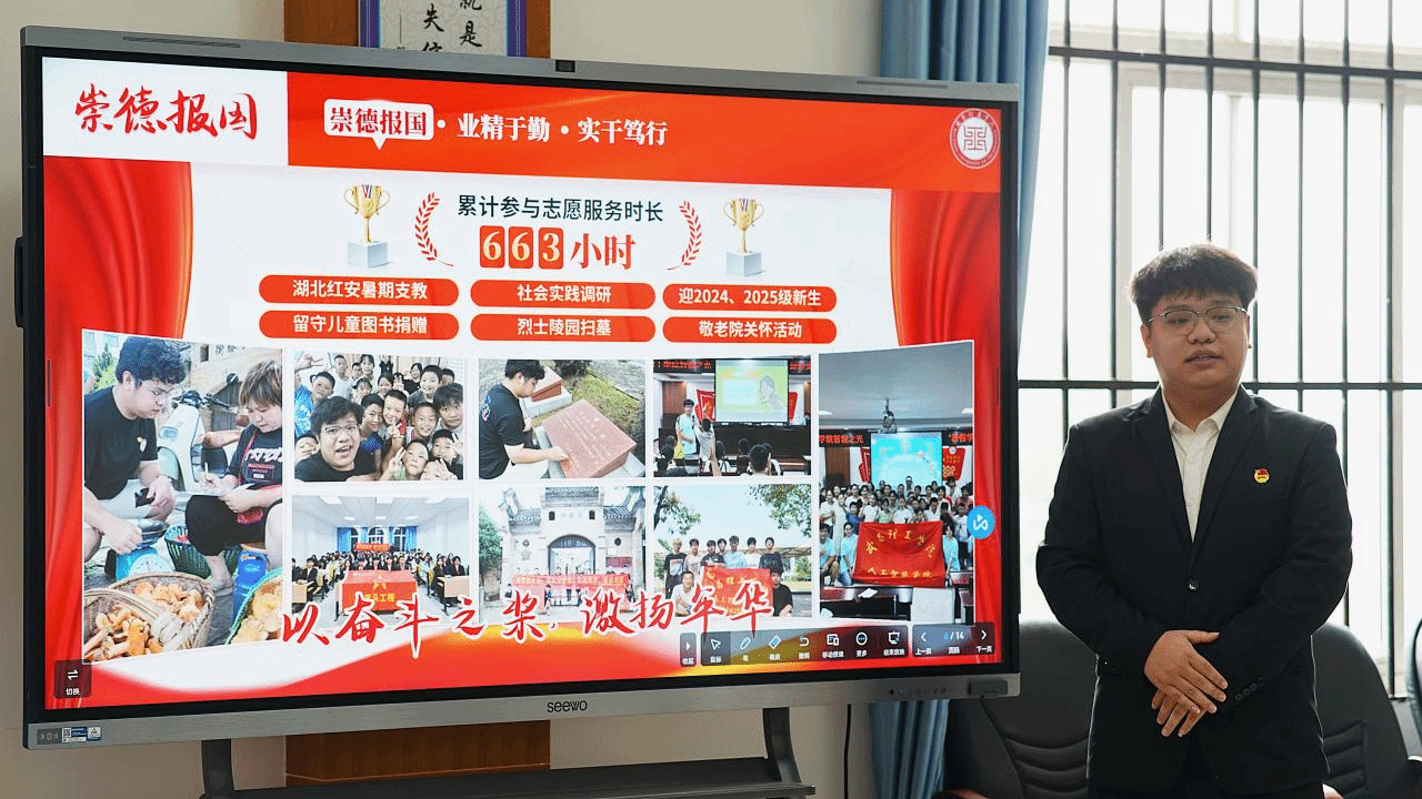 在候选人陈述环节,23名智能学子按照抽顺序依次上台汇报,通过“课件+论述”直观展示个人学业成绩、实践经历、竞赛获奖情况及志愿服务时长等核心成果。答辩现场呈现百花齐放的良好态势,其中,既有凭借“学业成绩与综测排名双第一”脱颖而出的学霸学子,用扎实的专业知识展现学习能力;也有在智能算法优化、机器人创新设计等领域的竞赛中,斩获省级以上重要奖项的技术先锋,以硬核实力诠释创新精神。智能学子们的精彩表现,赢得了评审团的认可,生动诠释人工智能学院“勤学善思、笃行实干”的良好精神风貌。